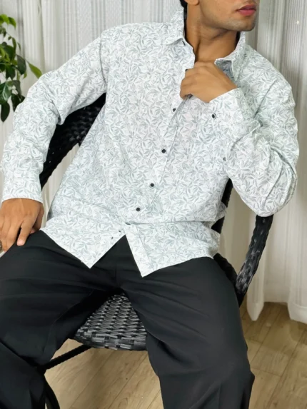 This beige cotton shirt features an elegant leaf print for a subtle, nature-inspired look. Made from 100% soft and breathable cotton, it’s perfect for casual outings and stylish everyday wear. Its comfortable fit and earthy tones create a versatile piece that easily pairs with any trousers.